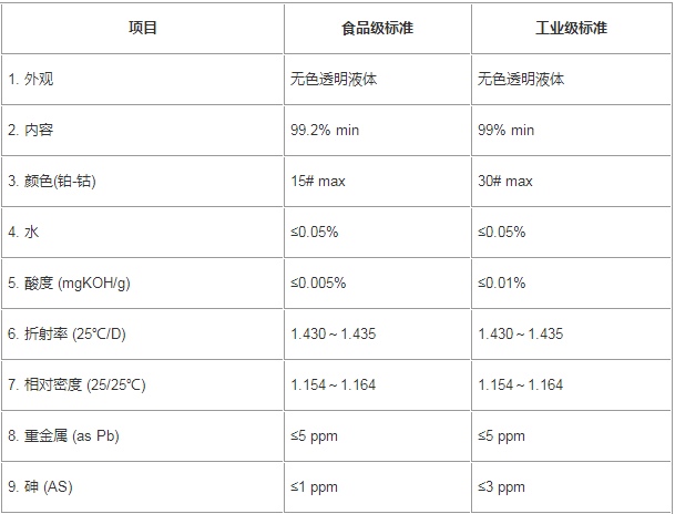 用途:本品主要用作香煙過濾嘴用醋纖嘴棒的增塑劑;香料、香精的固定香劑;化妝品制造、食用膠基制品制造、特殊溶劑及食品塑膠制品的無毒增塑劑。鑄造樹脂用固化劑。